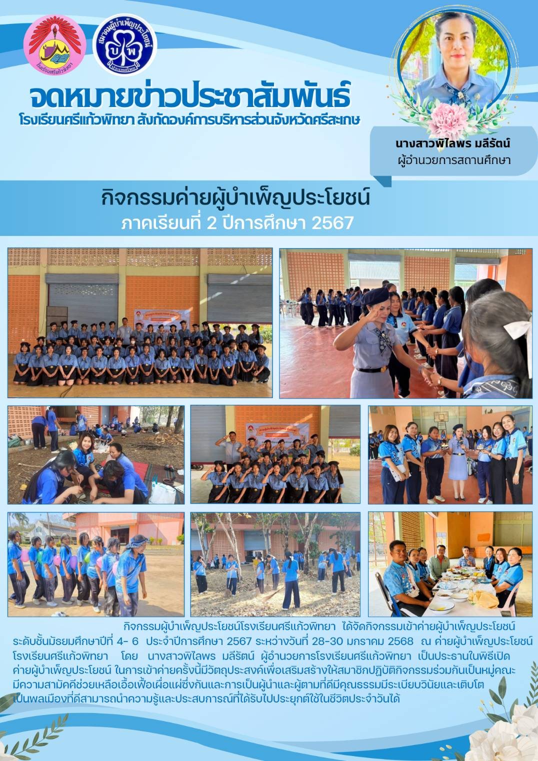 กิจกรรมผู้บำเพ็ญประโยชน์โรงเรียนศรีแก้วพิทยา ได้จัดกิจกรรมเข้าค่ายผู้บำเพ็ญประโยชน์ ระดับชั้นมัธยมศึกษาปีที่ 4-6 ประจำปีการศึกษา 2567 ระหว่างวันที่ 28-30 เดือน มกราคม พ.ศ.2568 ณ ค่ายผู้บำเพ็ญประโยชน์ชั่วคราว โดย นางสาวพิไลพร มลีรัตน์ ผู้อำนวยการโรงเรียนศรีแก้วพิทยา เป็นประธานในพิธีเปิดค่ายผู้บำเพ็ญประโยชน์ ในการเข้าค่ายในครั้งนี้มีวัตถุประสงค์เพื่อเสริมสร้างให้สมาชิกผู้บำเพ็ญประโยชน์ปฏิบัติกิจกรรมร่วมกันเป็นหมู่คณะ มีความสามัคคี ช่วยเหลือเอื้อเฟื้อเผื่อแผ่ซึ่งกันและกัน ฝึกการเป็นผู้นำและผู้ตามที่ดี มีคุณธรรม มีระเบียบวินัย และเติบโตเป็นพลเมืองที่ดี สามารถนำความรู้และประสบการณ์ที่ได้รับไปประยุกต์ใช้ในชีวิตประจำวันได้