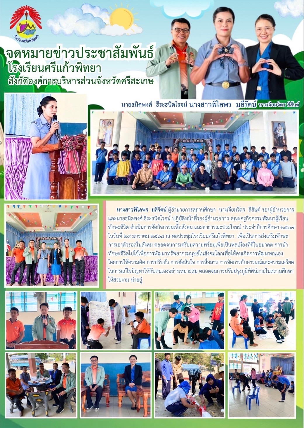 นางสาวพิไลพร มลีรัตน์ ผู้อำนวยการสถานศึกษา นางเจียมจิตร สีสันต์ รองผู้อำนวยการสถานศึกษาและนายธนิตพงศ์ ธีระธนิตโรจน์ ปฏิบัติหน้าที่รองผู้อำนวยการสถานศึกษา คณะครูกิจกรรมพัฒนาผู้เรียนทักษะชีวิต ดำเนินการจัดกิจกรรมเพื่อสังคมและสาธารณะประโยชน์ ประจำปีการศึกษา 2567 ในวันที่่ 29 มกราคม 2568 ณ หอประชุมโรงเรียนศรีแก้วพิทยา เพื่อเป็นการส่งเสริมทักษะการเอาตัวรอดในสังคม ตลอดจนเตรียมความพร้อมเพื่อเป็นพลเมืองดีในอนาคต การนำทักษะชีวิตไปใช้เพื่อการพัฒนาทรัพยากรมนุษย์ในสังคมโลก เพื่อให้คนเกิดการพัฒนาตนเอง โดยการใช้ความคิด การปรับตัว การตัดสินใจ การสื่อสาร การจัดการกับอารมณ์และความเครียด ในการแก้ไขปัญหาให้กับตนเองอย่างเหมาะสม ตลอดจนการปรับปรุงภูมิทัศน์ภายในสถานศึกษาให้สวยงาม น่าอยู่ น่าดู น่าเรียน
