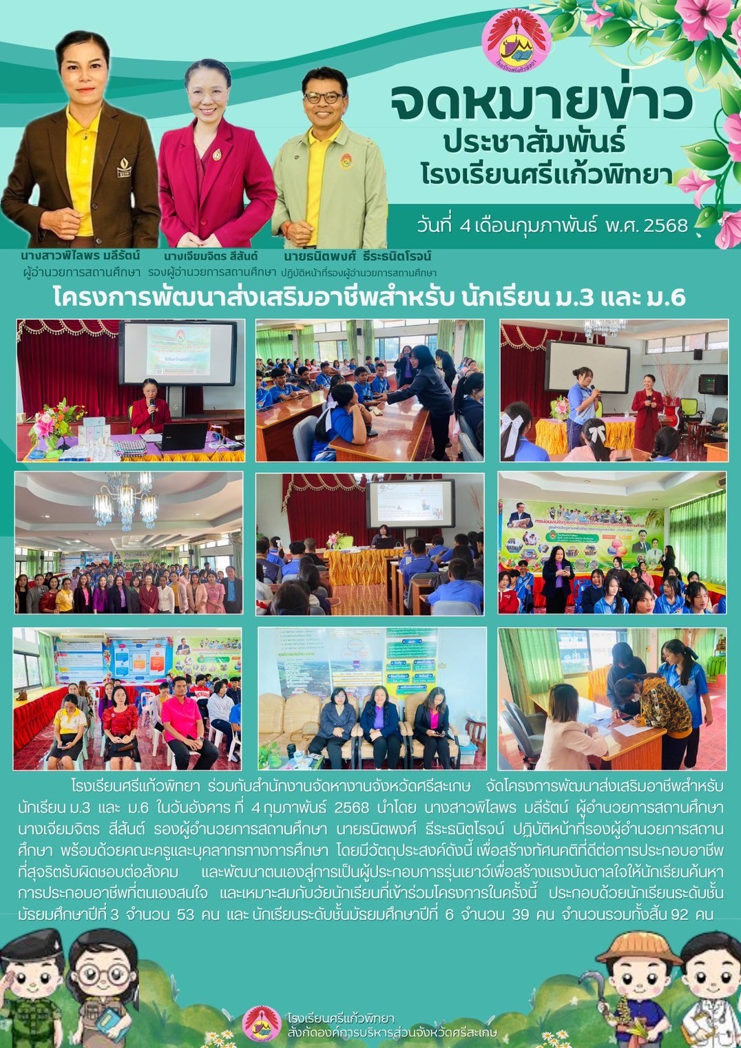 โรงเรียนศรีแก้วพิทยา ร่วมกับสำนักงานจัดหางานจังหวัดศรีสะเกษ จัดโครงการพัฒนาส่งเสริมอาชีพสำหรับนักเรียน ม.3 และ ม.6 ในวันอังคาร ที่ 4 เดือน กุมภาพันธ์ พ.ศ. 2568 นำโดย นางสาวพิไลพร มลีรัตน์ ผู้อำนวยการสถานศึกษา นางเจียมจิตร สีสันต์ รองผู้อำนวยการสถานศึกษา นายธนิตพงศ์ ธีระธนิตโรจน์ ปฏิบัติหน้าที่ รองผู้อำนวยการสถานศึกษาพร้อมด้วยคณะครูและบุคลากรทางการศึกษา โดยมีวัตถุประสงค์ดังนี้ เพื่อสร้างทัศนคติที่ดีต่อการประกอบอาชีพที่สุจริตรับผิดชอบต่อสังคม และพัฒนาตนเองสู่การเป็นผู้ประกอบการรุ่นเยาว์ เพื่อสร้างแรงบันดาลใจให้นักเรียนค้นหา การประกอบอาชีพที่ตนเองสนใจ ในการจัดกิจกรรมครั้งนี้ ประกอบด้วย นักเรียนระดับชั้น ม.3 จำนวน 53 คน นักเรียนระดับชั้น ม.6 จำนวน 39 คน รวมจำนวนผู้เข้าร่วมทั้งสิ้น 92 คน ซึ่งการจัดกิจกรรมสำเร็จลุล่วงไปด้วยดี