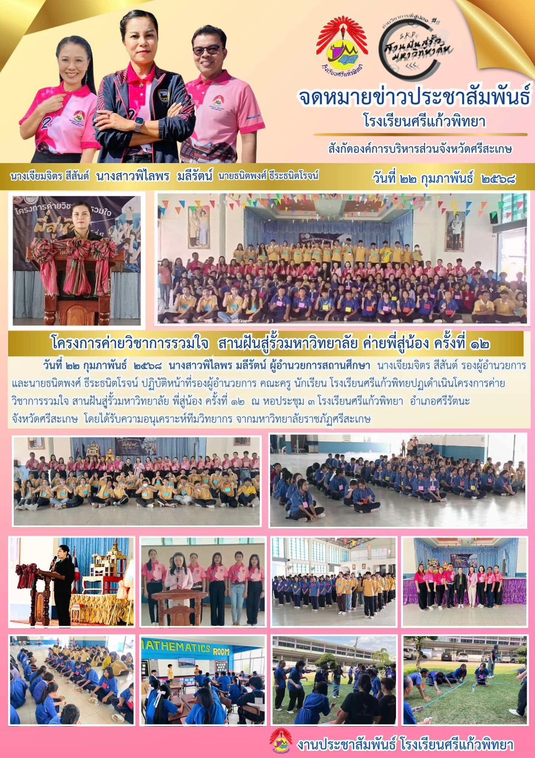 ในวันเสาร์ ที่ 22 เดือน กุมภาพันธ์ พ.ศ.2568 โรงเรียนศรีแก้วพิทยา สังกัดองค์การบริหารส่วนจังหวัดศรีสะเกษ ภายใต้การบริหารงานโดย นางสาวพิไลพร มลีรัตน์ ผู้อำนวยการสถานศึกษา ได้ดำเนินโครงการค่ายวิชาการรวมใจ สานฝันสู่รั้วมหาวิทยาลัย "ค่ายพี่สู่น้อง" ครั้งที่ 12 ณ หอประชุม 3 โรงเรียนศรีแก้วพิทยา อำเภอศรีรัตนะ จังหวัดศรีสะเกษ โดยได้รับความอนุเคราะห์ทีมวิทยากรพี่ ๆ นักศึกษาจาก มหาวิทยาลัยราชภัฏศรีสะเกษ และมหาวิทยาลัยอุบลราชธานี โดยมีทีมแกนนำวิทยากร เป็นพี่ ๆ ศิษย์เก่าจากโรงเรียนศรีแก้วพิทยา บรรยากาศในการเข้าค่ายเต็มเปี่ยมไปด้วย มิตรภาพและความหวังดีจากรุ่นพี่สู่รุ่นน้อง มีการแลกเปลี่ยนทัศนคติ ประสบการณ์ตรงในมหาวิทยาลัย และเปิดโลกทัศน์ ทางการศึกษาในระดับอุดมศึกษา ให้แก่รุ่นน้อง มีกิจกรรม สานสัมพันธ์ระหว่างรุ่นพี่กับรุ่นน้อง ซึ่งในการเข้าค่ายในปีนี้ บรรลุวัตถุประสงค์ของการจัดกิจกรรมได้เป็นอย่างดี