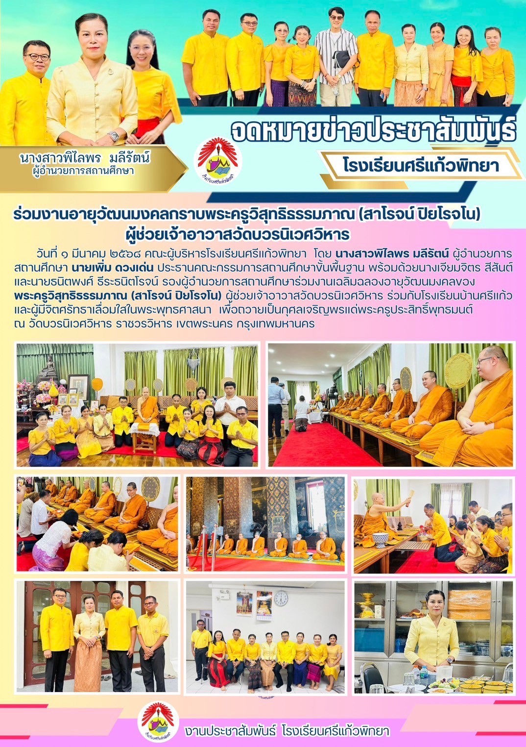 วันที่ 1 มีนาคม 2568 คณะผู้บริหารโรงเรียนศรีแก้วพิทยา ร่วมงานฉลองอายุวัฒนมงคลของ พระครูวิสุทธิธรรมภาณ (สาโรจน์ ปิยโรจโน) ผู้ช่วยเจ้าอาวาสวัดบวรนิเวศวิหาร โดยร่วมกับโรงเรียนบ้านศรีแก้ว และผู้มีจิตศรัทธาเลื่อมใสในพระพุทธศาสนา เพื่อถวายเป็นกุศลเจริญพรแด่พระครูวิสุทธิธรรมภาณ (สาโรจน์ ปิยโรจโน) ณ วัดบวรนิเวศวิหาร ราชวรวิหาร เขตพระนคร กรุงเทพมหานคร