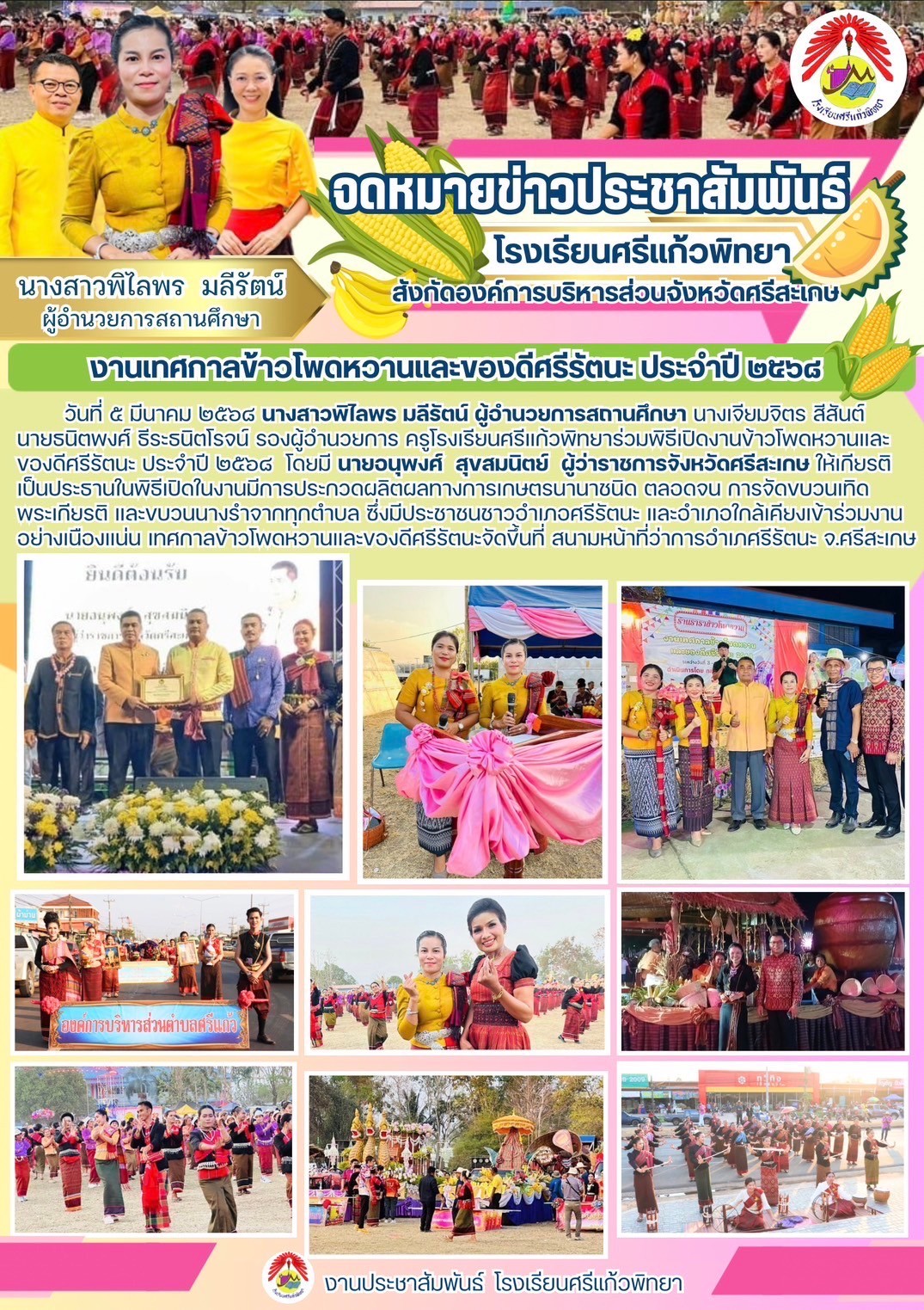 วันที่ 5 มีนาคม 2568 คณะผู้บริหารและคณะครูโรงเรียนศรีแก้วพิทยา ร่วมงานพิธีเปิดงานข้าวโพดหวานและของดีศรีรัตนะ ประจำปี พ.ศ.2568 โดยมี นายอนุพงษ์ สุขสมนิตย์ ผู้ว่าราชการจังหวัดศรีสะเกษ ให้เกียรติมาเป็นประธานในพิธีเปิด ในงานมีการประกวดผลผลิตทางการเกษตร นานาชนิด ตลอดจน การจัดขบวนเทิดพระเกียรติ และขบวนนางรำจากทุกตำบล ซึ่งทางโรงเรียนได้รับผิดชอบในส่วนกิจกรรม ซุ้มธาราข้าวโพดหวาน ในคืนแรก ซึ่งมีประชาชนชาวอำเภอศรีรัตนะ และอำเภอใกล้เคียงเข้าร่วมงานอย่างเนืองแน่น เทศกาลข้าวโพดหวานและของดีศรีรัตนะ จัดขึ้นที่ บริเวณ สนามที่ว่าการอำเภอศรีรัตนะ จังหวัดศรีสะเกษ