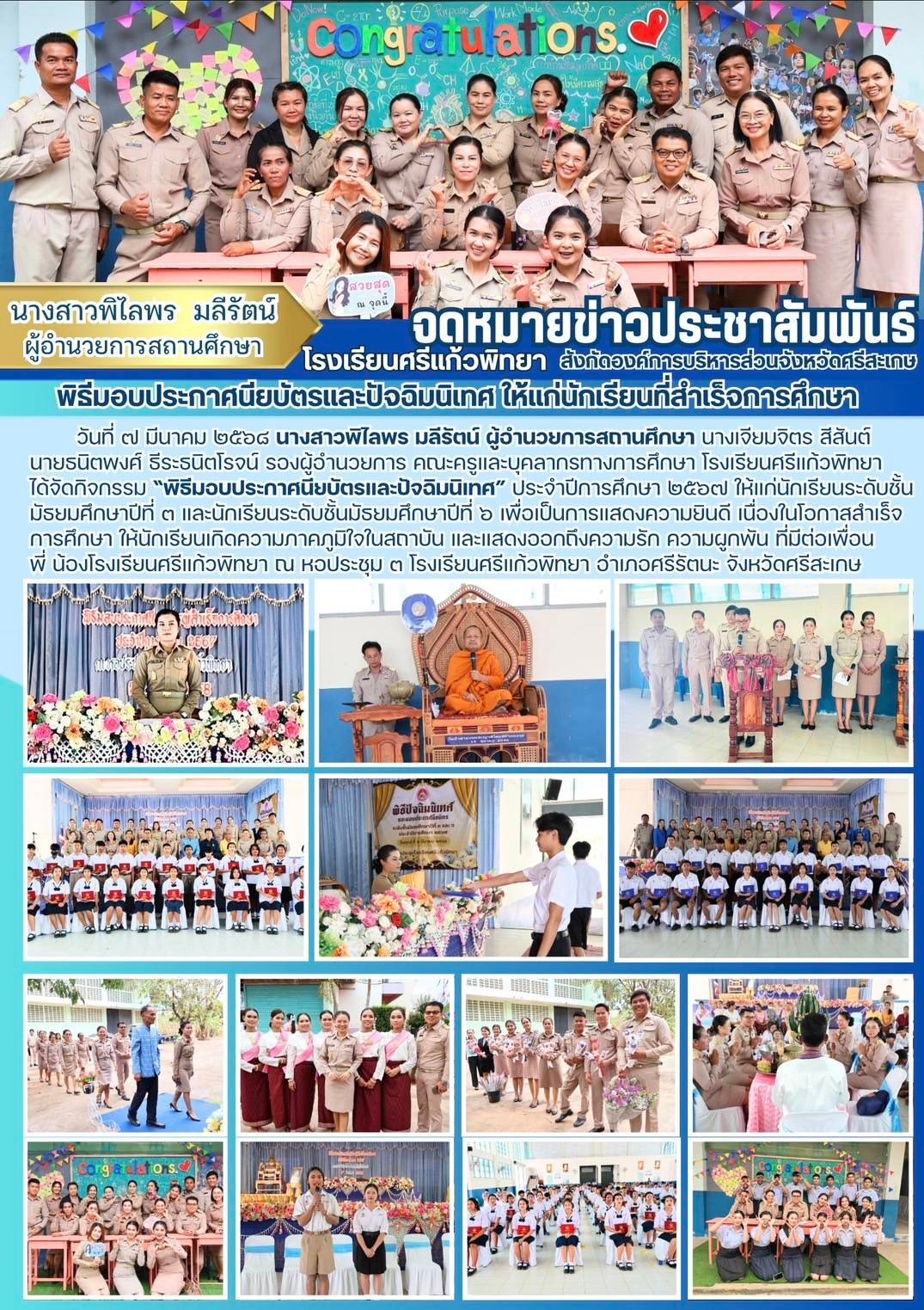 วัน ศุกร์ ที่ 7 มีนาคม พ.ศ.2568 โรงเรียนศรีแก้วพิทยาได้จัดกิจกรรม "พิธีมอบประกาศนียบัตรและปัจฉิมนิเทศ" ประจำปีการศึกษา 2567 ให้แก่นักเรียนระดับชั้น มัธยมศึกษาปีที่ 3 และ นักเรียนระดับชั้นมัธยมศึกษาปีที่ 6 เพื่อเป็นการแสดงความยินดี เนื่องในโอกาสสำเร็จการศึกษา ให้นักเรียนเกิดความภาคภูมิใจในสถาบัน และแสดงออกถึงความรัก ความผูกผัน ที่ต่อเพื่อน พี่น้องโรงเรียนศรีแก้วพิทยา โดยบรรยากาศเป็นไปด้วยความอิ่มเอมใจของผู้ปกครองที่ได้เห็นความสำเร็จอีกขั้นของบุตรหลาน คณะครูและนักเรียนที่ได้แสดงออกถึงความผูกพัน และความปรารถนาดีต่อกัน โดยจัดกิจกรรม ณ บริเวณ หอประชุม 3 โรงเรียนศรีแก้วพิทยา อำเภอศรีรัตนะ จังหวัดศรีสะเกษ