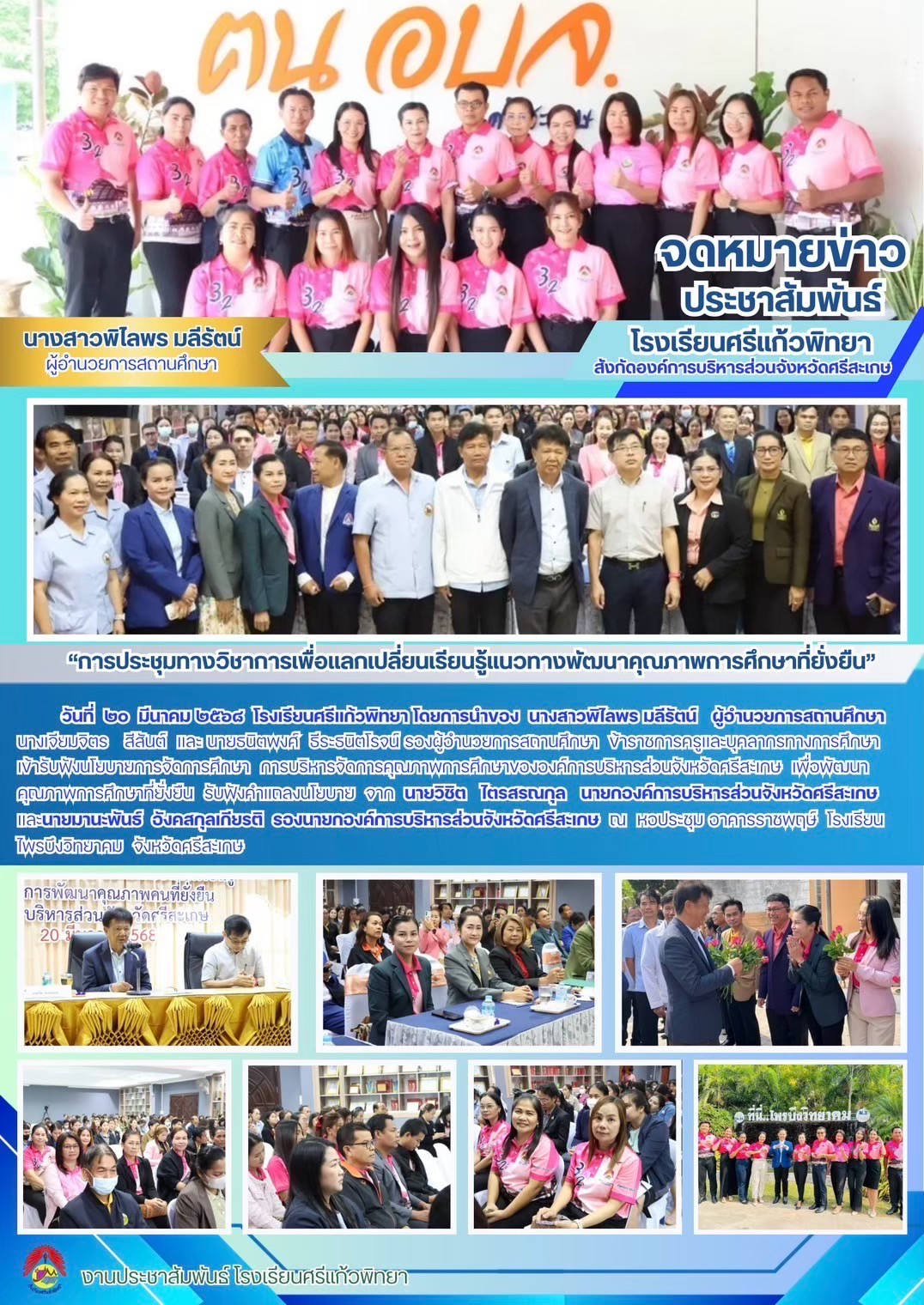 วันที่ 20 มีนาคม 2568 โรงเรียนศรีแก้วพิทยา โดยการนำของนางสาวพิไลพร มลีรัตน์ ได้เข้าร่วมรับฟังนโยบายการจัดการศึกษา การบริหารจัดการคุณภาพการศึกษาขององค์การบริหารส่วนจังหวัด เพื่อพัฒนาคุณภาพการศึกษาที่ยั่งยืน รับฟังคำแถลงนโยบาย จาก นายวิชิต ไตรสรณกุล นายกองค์การบริหารส่วนจังหวัดศรีสะเกษ ณ หอประชุมอาคารราชพฤกษ์ โรงเรียนไพรบึงวิทยาคม จังหวัดศรีสะเกษ