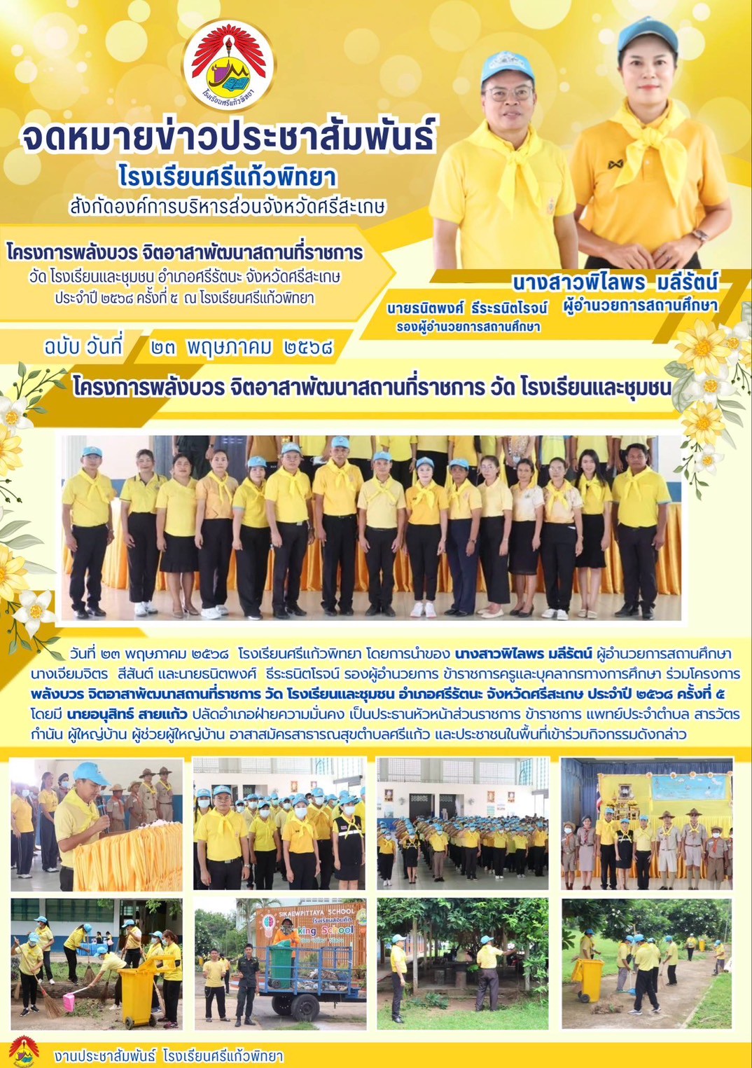 วันที่ 23 พฤษภาคม 2568 โรงเรียนศรีแก้วพิทยา โดยการนำของนางสาวพิไลพร มลีรัตน์ ผู้อำนวยการสถานศึกษา นางเจียมจิตร สีสันต์ และนายธนิตพงศ์ ธีระธนิตโรจน์ รองผู้อำนวยการสถานศึกษา ข้าราชการครูและบุคลากรทางการศึกษา ร่วมโครงการพลังบวร จิตอาสาพัฒนาสถานที่ราชการ วัด โรงเรียน และชุมชน อำเภอศรีรัตนะ จังหวัดศรีสะเกษ ประจำปี 2568 ครั้งที่ 5 โดยมีนายอนุสิทธิ์ สายแก้ว ปลัดอำเภอฝ่ายความมั่นคง เป็นประธานหัวหน้าส่วนราชการ ข้าราชการ แพทย์ประจำตำบล สารวัตร กำนัน ผู้ใหญ่บ้าน ผู้ช่วยผู้ใหญ่บ้าน อาสาสมัครสาธารณสุขตำบลศรีแก้ว และประชาชนในพื้นที่เข้าร่วมกิจกรรมดังกล่าว โดยโรงเรียนศรีแก้วพิทยา เป็นสถานที่ในการจัดกิจกรรมในครั้งนี้ บรรยากาศแห่งความร่วมแรงร่วมใจ พัฒนา อาคารสถานที่ เป็นไปด้วย่ความเรียบร้อย