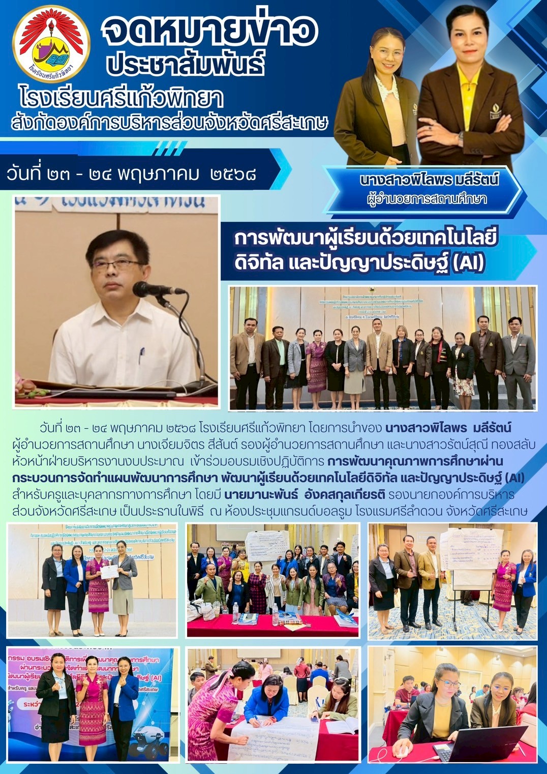 วันที่ 23 - 24 พฤษภาคม 2568 โรงเรียนศรีแก้วพิทยา โดยการนำของนางสาวพิไลพร มลีรัตน์ ผู้อำนวยการสถานศึกษา นางเจียมจิตร สีสันต์ รองผู้อำนวยการสถานศึกษา และนางสาวรัตน์สุณี ทองสลับ หัวหน้าฝ่ายบริหารงานงบประมาณ เข้าร่วมอบรมเชิงปฏิบัติการ การพัฒนาคุณภาพการศึกษาผ่านกระบวนการจัดทำแผนพัฒนาการศึกษา พัฒนาผู้เรียนด้วยเทคโนโลยีดิจิทัล และปัญญาประดิษฐ์ (AI) สำหรับครูและบุคลากรทางการศึกษา โดยมี นายมานะพันธ์ อังคสกุลเกียรติ รองนายกองค์การบริหารส่วนจังหวัดศรีสะเกษ เป็นประธานในพิธี ณ ห้องประชุมแกรนด์บอลรูม โรงแรมศรีลำดวน จังหวัดศรีสะเกษ