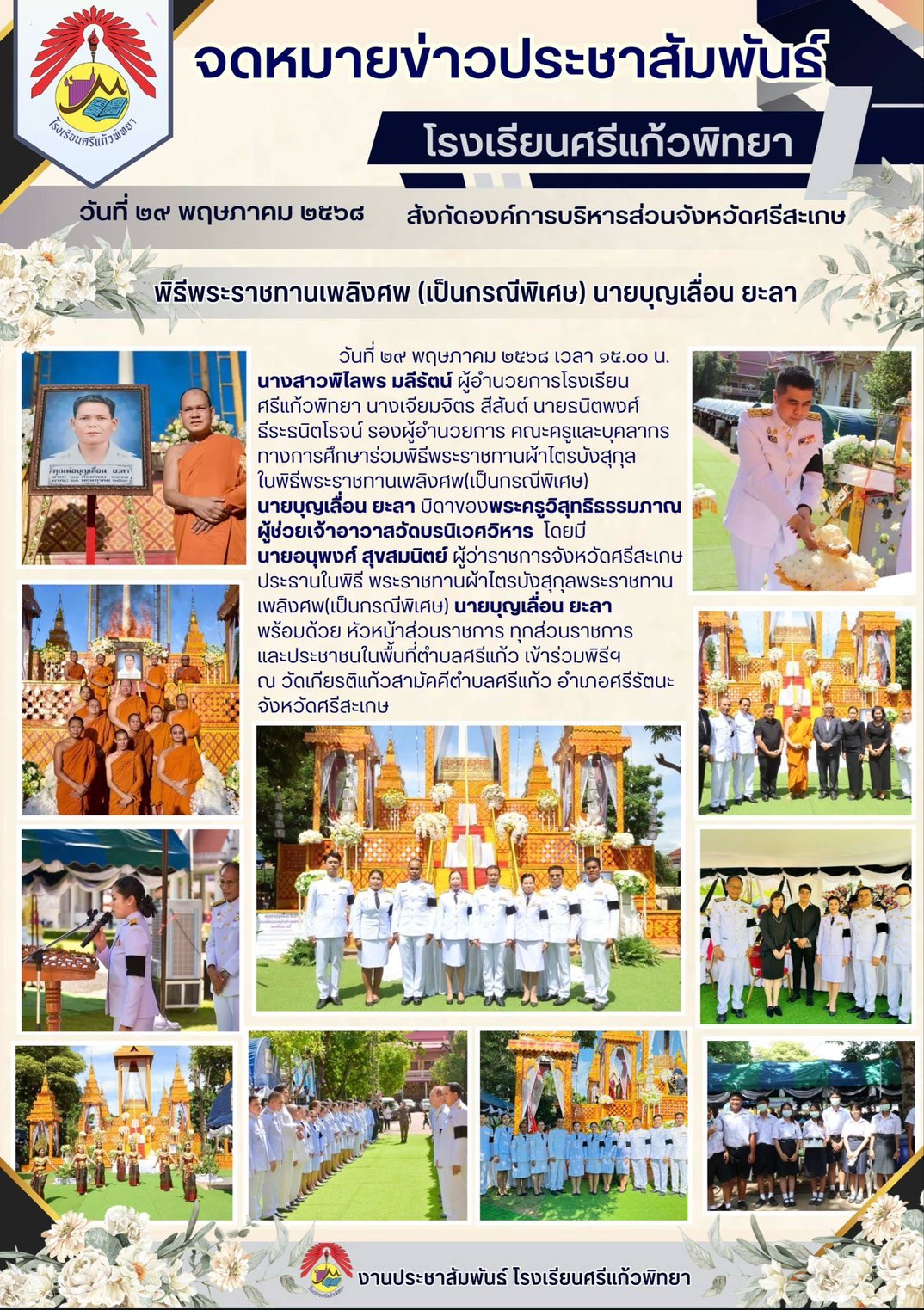 วันที่ 29 พฤษภาคม 2568 เวลา 15.00 น. นางสาวพิไลพร มลีรัตน์ ผู้อำนวยการสถานศึกษา นางเจียมจิตร สีสันต์และนายธนิตพงศ์ ธีระธนิตโรจน์ รองผู้อำนวยการสถานศึกษา คณะครูและบุคลากรทางการศึกษาร่วมพิธีพระราชทานเพลิงศพ(เป็นกรณีพิเศษ) นายบุญเลื่อน ยะลา บิดาของพระครูวิสุทธิธรรมภาณ ผู้ช่วยเจ้าอาวาสวัดบวรนิเวศวิหาร โดยมี นายอนุพงศ์ สุขสมนิตย์ ผู้ว่าราชการจังหวัดศรีสะเกษ เป็นประธานในพิธี พระราชทานผ้าไตรบังสุกุลพระราชทานเพลิงศพ(เป็นกรณีพิเศษ นายบุญเลื่อน ยะลา พร้อมด้วยหัวหน้าส่วนราชการ ทุกส่วนราชการและประชาชนในพื้นที่ตำบลศรีแก้ว และพื้นที่ใกล้เคียง ภายในเขต อำเภอศรีรัตนะ จังหวัดศรีสะเกษ ประชาชนมาร่วมงานอย่างล้นหลาม เนื่องจากท่านผู้วายชนม์ เป็นบุคคลที่ช่วยเหลือชุมชน ทั้ง บ้าน วัด โรงเรียน โรงพยาบาล