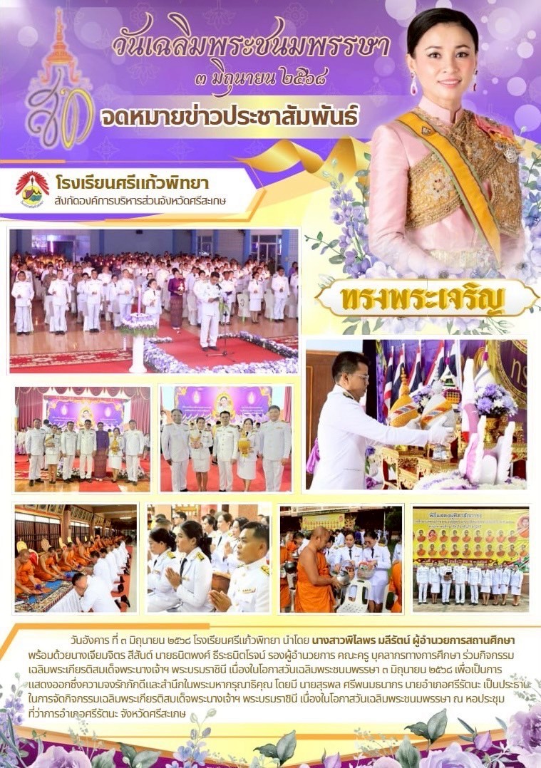 วันอังคาร ที่ 3 เดือน มิถุนายน พ.ศ.2568 โรงเรียนศรีแก้วพิทยา นำโดย นางสาวพิไลพร มลีรัตน์ ผู้อำนวยการสถานศึกษา พร้อมด้วย นางเจียมจิตร สีสันต์ นายธนิตพงศ์ ธีระธนิตโรจน์ รองผู้อำนวยการสถานศึกษา บุคลากรทางการศึกษา ร่วมกิจกรรม เฉลิมพระเกียรติสมเด็จพระนางเจ้า ฯ พระบรมราชินี เนื่องในโอกาสวันเฉลิมพระชนมพรรษา 3 มิถุนายน 2568 เพื่อเป็นการแสดงออกซึ่งความจงรักภักดีและสำนึกในพระมหากรุณาธิคุณ โดยมี นายสุรพล ศรีพนมธนากร นายอำเภอศรีรัตนะ เป็นประธานในการจัดกิจกรรมเฉลิมพระเกียรติสมเด็จพระนางเจ้า ฯ พระบรมราชินีเนื่องในโอกาสวันเฉลิมพระชนมพรรษา ณ หอประชุมที่ว่าการอำเภอศรีรัตนะ จังหวัดศรีสะเกษ