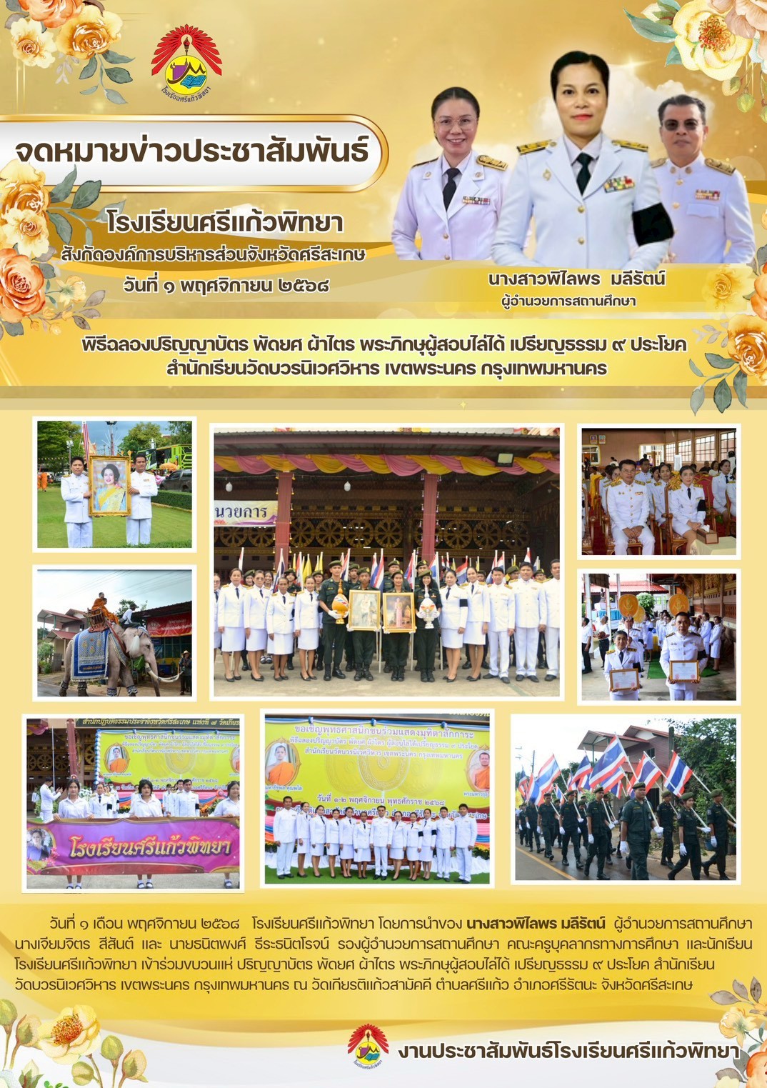 วันที่ ๑ เดือน พฤศจิกายน ๒๕๖๘ โรงเรียนศรีแก้วพิทยา นำโดยท่าน ผู้อำนวยการพิไลพร มลีรัตน์ ท่านรองผู้อำนวยการ คณะครูและบุคลากรทางการศึกษา และนักเรียนโรงเรียนศรีแก้วพิทยา เข้าร่วมขบวนแห่ ปริญญาบัตร พัดยศ ผ้าไตร พระภิกษุผู้สอบไล่ได้ เปรียญธรรม ๙ ประโยค สำนักเรียนวัดบวรนิเวศวิหาร เขตพระนคร กรุงเทพมหานคร ณ วัดเกียรติแก้วสามัคคี ตำบลศรีแก้ว อำเภอศรีรัตนะ จังหวัดศรีสะเกษ