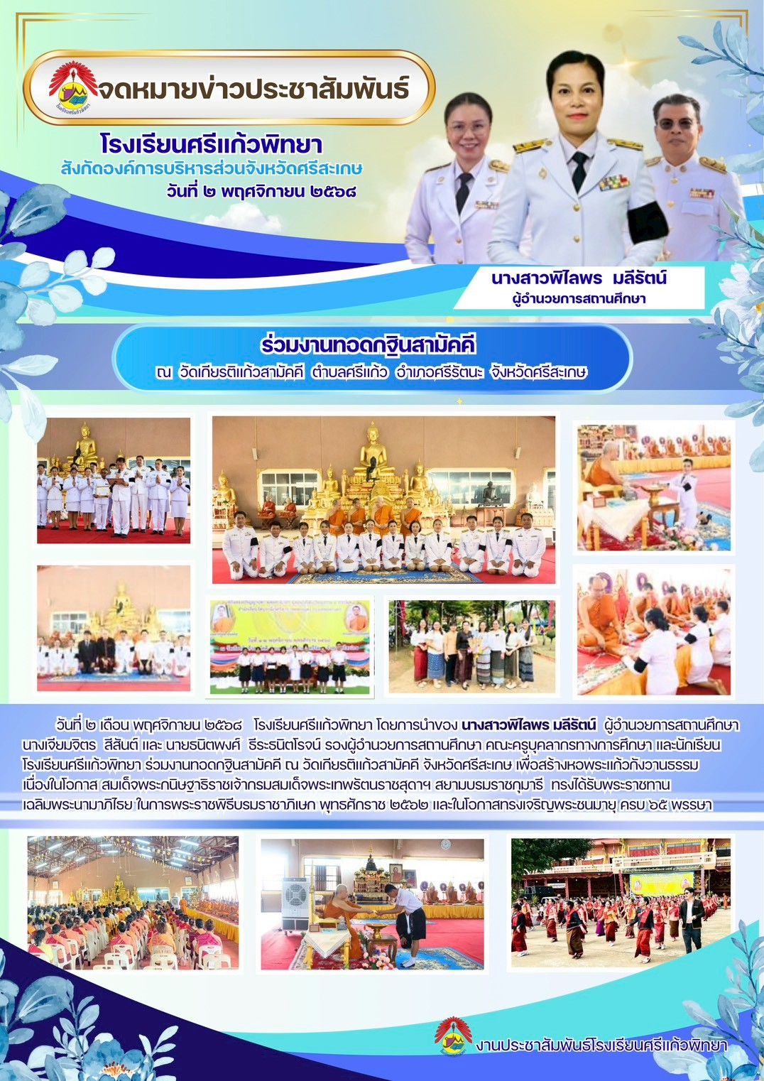 วันที่ ๒ เดือน พฤศจิกายน ๒๕๖๘ โรงเรียนศรีแก้วพิทยา นำโดยท่าน ผู้อำนวยการพิไลพร มลีรัตน์ ท่านรองผู้อำนวยการ คณะครูและบุคลากรทางการศึกษา เข้าร่วมงานบุญกฐิน และร่วมฉลองปริญญาบัตร พระภิกษุผู้สอบไล่ได้ เปรียญธรรม ๙ ประโยค สำนักเรียนวัดบวรนิเวศวิหาร เขตพระนคร กรุงเทพมหานคร และพานักเรียนเข้ารับทุนการศึกษา ณ วัดเกียรติแก้วสามัคคี ตำบลศรีแก้ว อำเภอศรีรัตนะ จังหวัดศรีสะเกษ