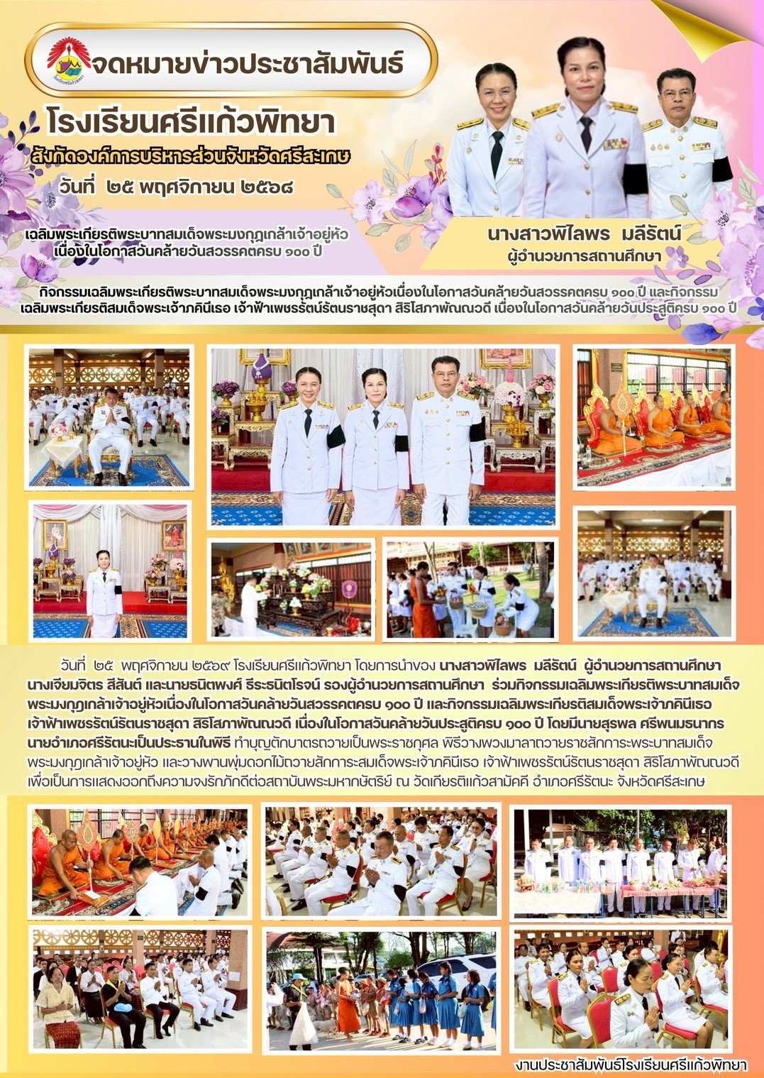 วันที่ 25 พฤศจิกายน 2569 โรงเรียนศรีแก้วพิทยา โดยการนำของ นางสาวพิไลพร มลีรัตน์ ร่วมกิจกรรมเฉลิมพระเกียรติพระบาทสมเด็จพระมงกุฏเกล้าเจ้าอยู่หัว เนื่องในวันคล้ายวันสวรรคตครบ 100 ปี และกิจกรรมเฉลิมพระเกียรติสมเด็จพระเจ้าภคินีเธอ เจ้าฟ้าเพชรรัตน์รัตนราชสุดา สิริโสภาพัณณวดี เนื่องในโอกาสวันคล้าบวันประสูติครบ 100 ปี โดยมีนายสุรพล ศรีพนมธนากร นายอำเภอศรีรัตนะ เป็นประธานในพิธี ทำบุญตักบาตรถวายเป็นพระราชกุศล พิธีวางพวงมาลาถวายราชสักการะพระบาทสมเด็จพระมงกุฏเกล้าเจ้าอยู่หัว และวางพานพุ่มดอกไม้ถวายสักการะ สมเด็จพระเจ้าภคินีเธอ เจ้าฟ้าเพชรรัตน์รัตนราชสุดา สิริโสภาพัณณวดี เพื่อเป็นการแสดงออกถึงความจงรัก ภักดี ต่อสถาบันพระมหากษัตริย์ ณ วัดเกียรติแก้วสามัคคี อำเภอศรีรัตนะ จังหวัดศรีสะเกษ