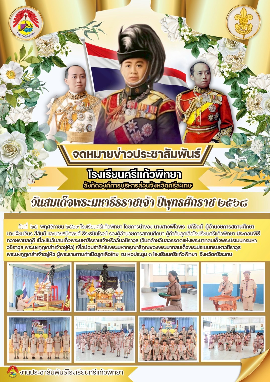 วันที่ 25 พฤศจิกายน 2568 โรงเรียนศรีแก้วพิทยา ประกอบพิธีถวายราชสดุดี เนื่องในวันสมเด็จพระมหาธีรราชเจ้า หรือวันวชิราวุธ (วันคล้ายวันสวรรคตแห่งพระบาทสมเด็จประปรเมนทรมหาวชิราวุธ พระมงกุฏเกล้าเจ้าอยู่หัว) เพื่อน้อมรำลึกในพระมหากรุณาธิคุณของ พระบาทสมเด็จประปรเมนทรมหาวชิราวุธ พระมงกุฏเกล้าเจ้าอยู่หัว ผู้พระราชทานกำเนิดลูกเสือไทย ณ หอประชุม 3 โรงเรียนศรีแก้วพิทยา จังหวัดศรีสะเกษ
