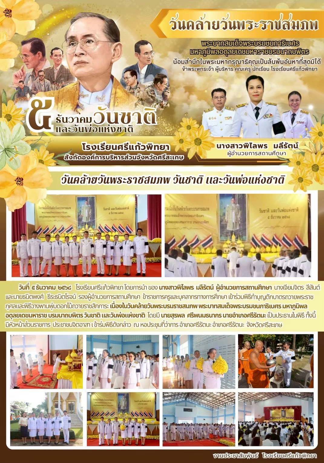 วันที่ 5 ธันวาคม 2568 โรงเรียนศรีแก้วพิทยา ได้เข้าร่วมพิธีทำบุญตักบาตรถวายพระราชกุศลและพิธีวางพานพุ่มดอกไม้ถวายราชสักการะ เนื่องในวันคล้ายวันพระบรมราชสมภพ พระบาทสมเด็จพระบรมชนกาธิเบศ มหาภูมิพลอดุลยเดชมหาราช บรมนาถบพิตร วันชาติ และวันพ่อแห่งชาติ โดยมี นายสุรพล ศรีพนมธนากร นายอำเภอศรีรัตนะ เป็นประธานในพิธี ทั้งนี้ มีหัวหน้าส่วนราชการ ประชาชนจิตอาสา เข้าร่วมพิธีดังกล่าว ณ หอประชุมที่ว่าการอำเภอศรีรัตนะ จังหวัดศรีสะเกษ