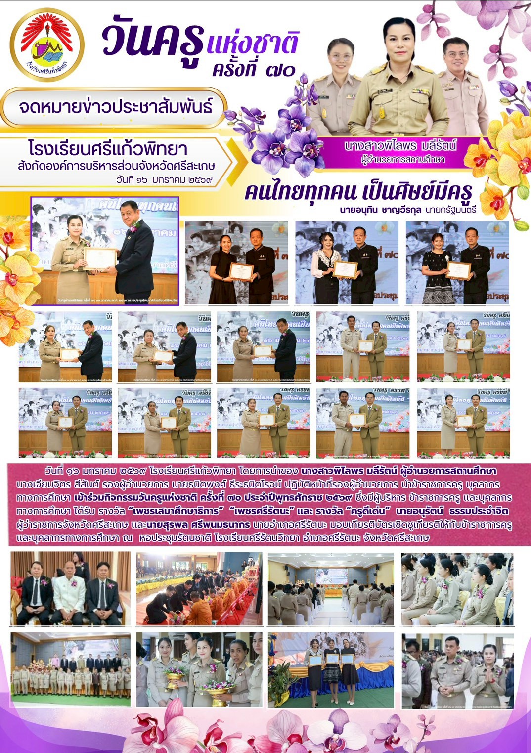 วันที่ 16 มกราคม 2569 โรงเรียนศรีแก้วพิทยา โดยการนำของนางสาวพิไลพร มลีรัตน์ ได้เข้าร่วมกิจกรรมวันครูแห่งชาติ ครั้งที่ 70 ประจำปี พ.ศ.2569 ซึ่งมีผู้บริหาร คณะครู และบุคลากรทางการศึกษาได้รับรางวัล "เพชรเสมาศึกษาธิการ" "เพชรศรีรัตนะ" และรางวัล "ครูดีเด่น" นายอนุรัตน์ ธรรมประจำจิต ผู้ว่าราชการจังหวัดศรีสะเกษ และ นายสุรพล ศรีพนมธนากร นายอำเภอศรีรัตนะ มอบเกียรติบัตรเชิดชูเกียรติให้กับข้าราชการครูและบุคลากรทางการศึกษา ณ หอประชุม รัตนชาติ โรงเรียนศรีรัตนวิทยา อำเภอศรีรัตนะ จังหวัดศรีสะเกษ